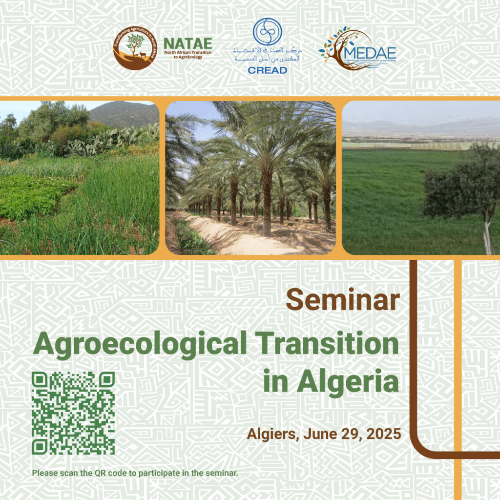 The Centre for Research in Applied Economics for Development (CREAD) and the Multi-Stakeholder Network of Agroecology in the Mediterranean (MEDAE) organised a seminar on “Agroecological transition in different ecosystems to address climate change in Algeria: reflections on a multi-stakeholder approach”. The seminar was attended by partners of the NATAE project but also agroecology professionals (farmers, networks and organizations), representatives of the agricultural administration, higher education, research and development agencies and the media.